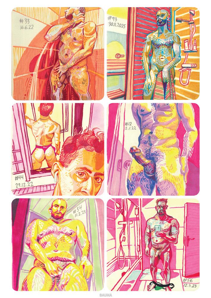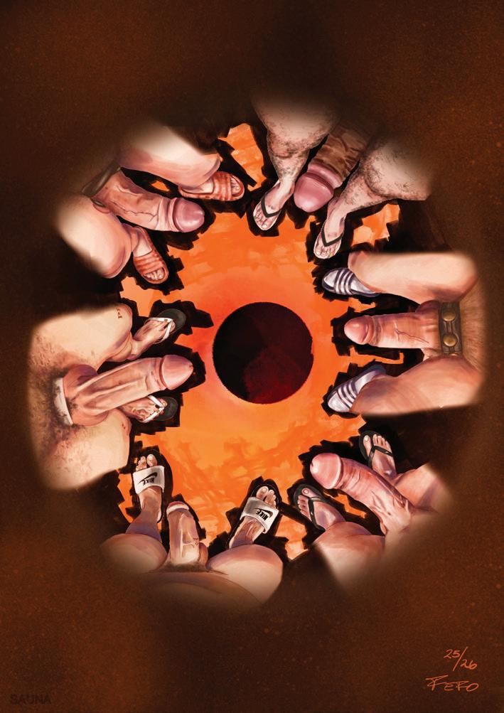 vulnerabilidade. O calor não permite disfarces: tudo escorre, tudo transborda. Assim, a sauna como espaço ambíguo – ao mesmo tempo íntimo e coletivo – coloca o corpo como território político, social e sensível, onde o suor não é apenas um resíduo biológico, mas uma linguagem; a nudez não é provocação gratuita, mas condição de igualdade; e o calor, um agente de transformação.