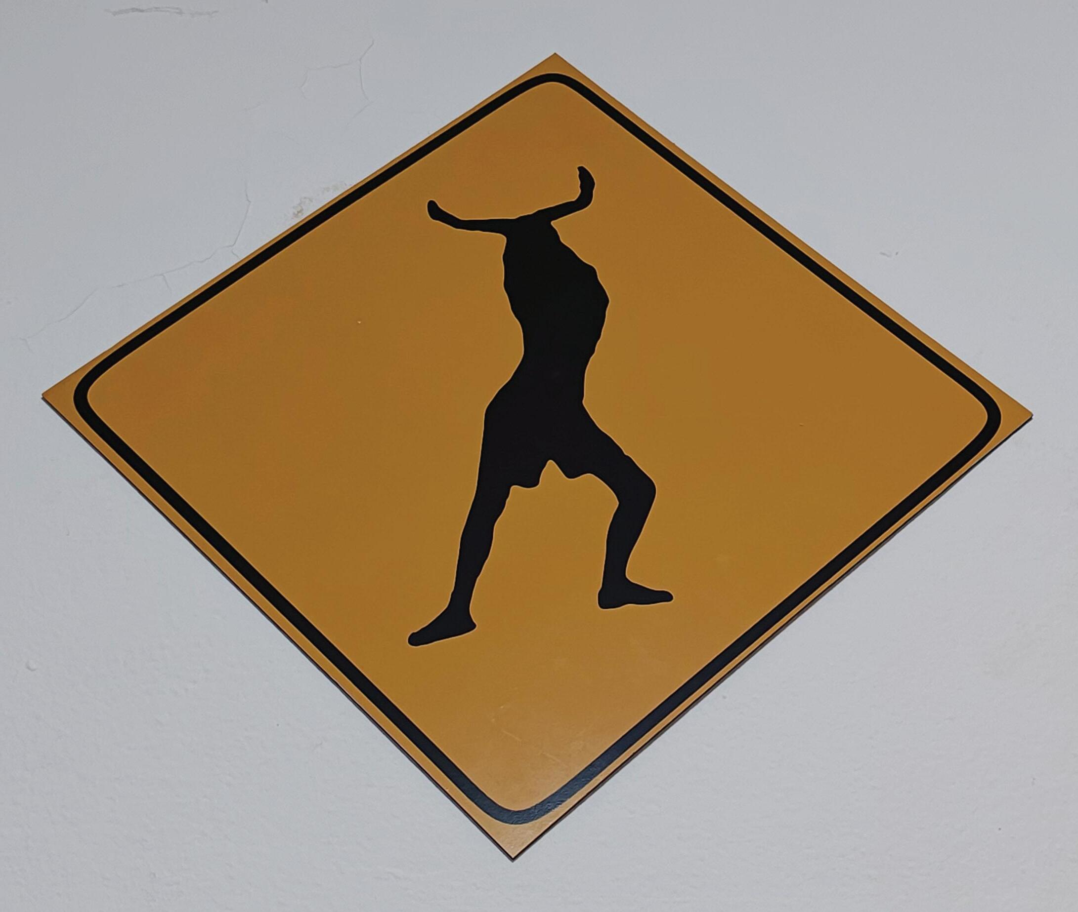 Placa de alerta: viadinho na pista (2022) objeto em papel fotográfico sobre placa de metal