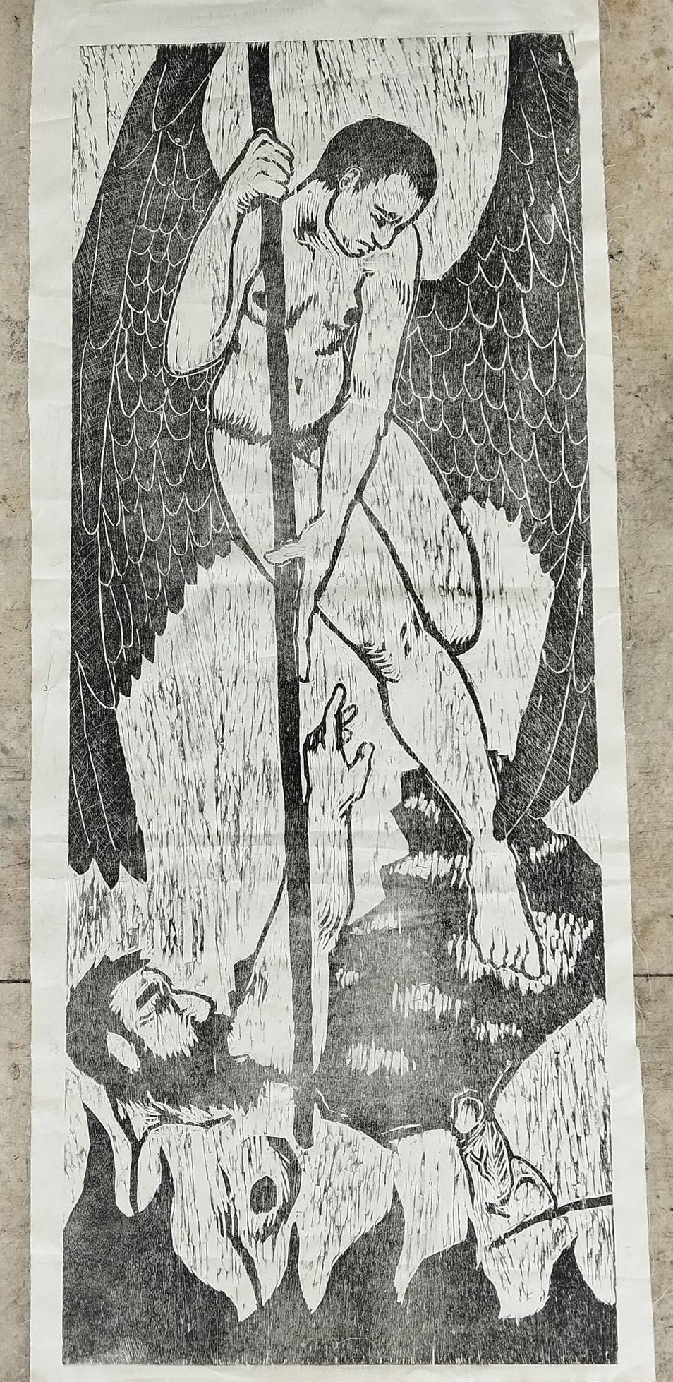 Precipitação do travequeiro ao inferno (2025) xilogravura sobre