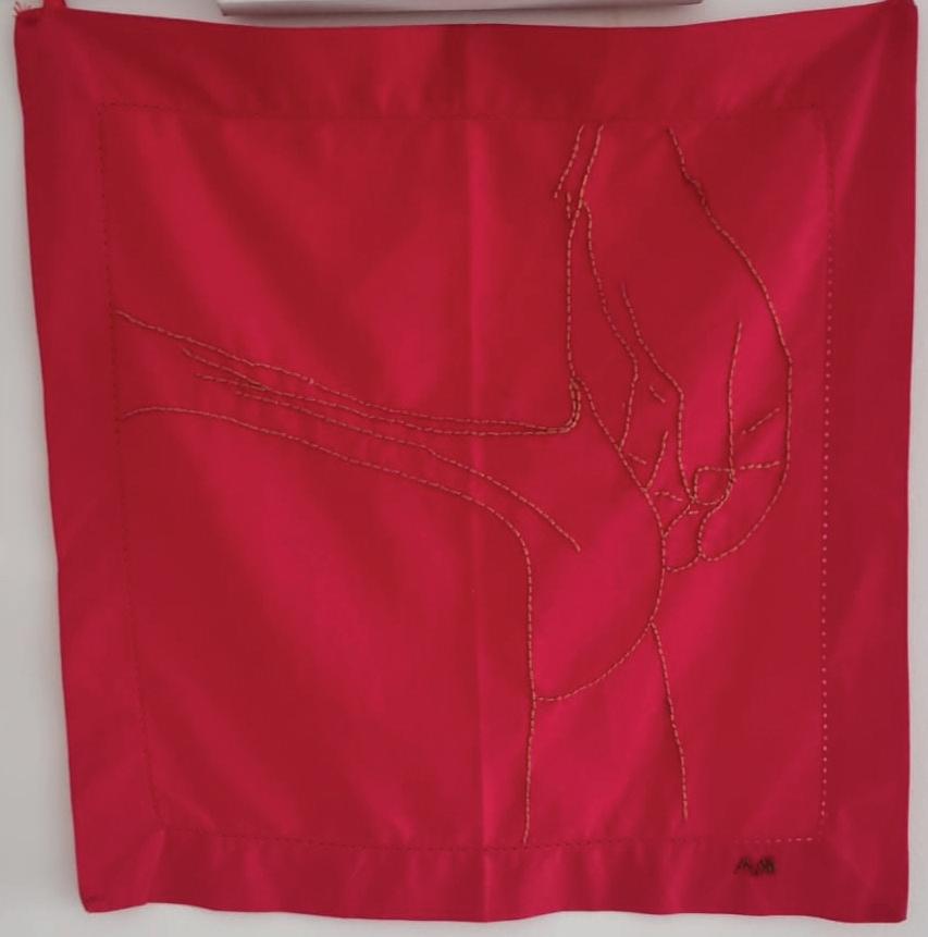bordado em tecido cru, linhas de costura e tinta acrílica em bastidor de madeira