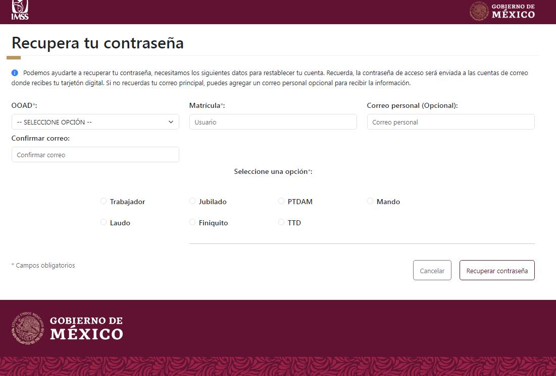 Así mismo, confirmar el tipo de nómina al que perteneces y seleccionar “Recuperar contraseña” .