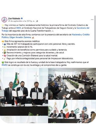 Firmó, junto con el secretario general del Sindicato Nacional de Trabajadores del Seguro Social, Dr. Rafael Olivos, el Contrato Colectivo de Trabajo 2025-2027, que constituye un hecho histórico por los avances que implica y por la votación personal, libre y secreta de más de 307 mil trabajadoras y trabajadores. Participó en el Foro Mundial de la Seguridad Social de la Asociación Internacional de la Seguridad Social (WSSF 2025), en Kuala Lumpur, Malasia, en donde dio a conocer los avances de México en esta materia; compartió el modelo de los Centros de Educación y Cuidado Infantil (CECI) y consiguió que