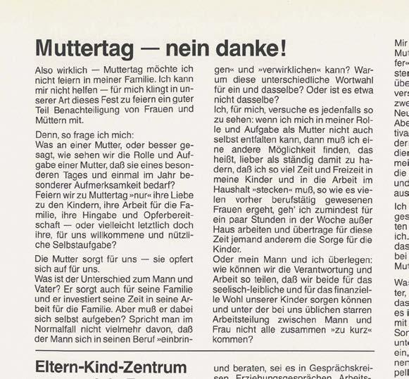 heutigen Familienkongress. Beeindruckend war auch, wie selbstverständlich und mit einem gewissen Nachdruck damals schon die Väter angesprochen wurden. In den ersten Ausgaben findet sich immer wieder die Aufforderung an Väter, sich aktiv in die Familie einzubringen. Das war für die damalige Zeit sehr fortschrittlich.