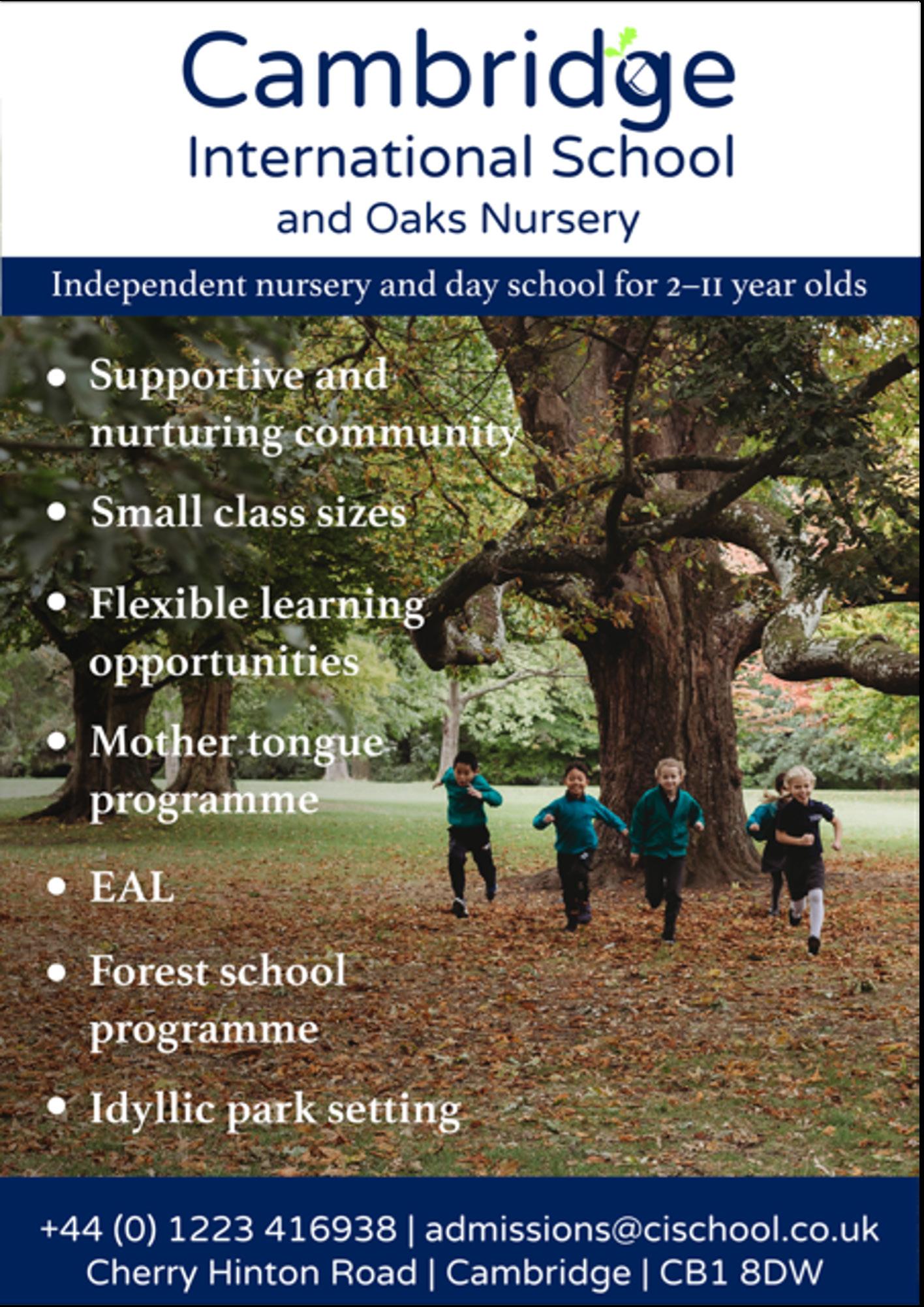 Cambridge International School is a thriving international school for 2 - 11 year olds and a welcoming community of children, parents and staff from the local area and overseas. With a focus on pupil well-being the school ensures that the children are learning in an unpressurised environment with a focus on them becoming confident, happy, resilient individuals.