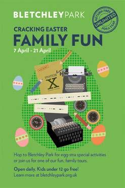 Bletchley Park, Milton Keynes. Egg-ceptional Easter activities, plus a fun interactive tour to fi nd out more about Bletchley park itself. 9.30am-5pm. Check website for tour and activities dates. Tickets are annual passes, activities are included (under 12yrs FREE). bletchleypark.org.uk
