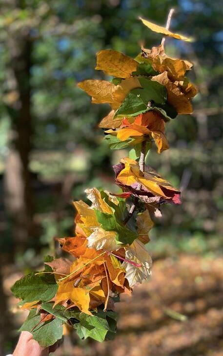 Atthestartofyourwalkfind along,slimbutstrongstick. Asyouwalk,threadonthe bestleavesthatyoufind.You mightwanttogoforalllarge leavesorallorangeleavesor maybeamix.Encourageevery memberofyourfamilytodo thesame–you’llbesurprised howdifferentallyourwands look.Onyourreturn,arrange yourleafwandsintoavasefor abeautifuldisplay.