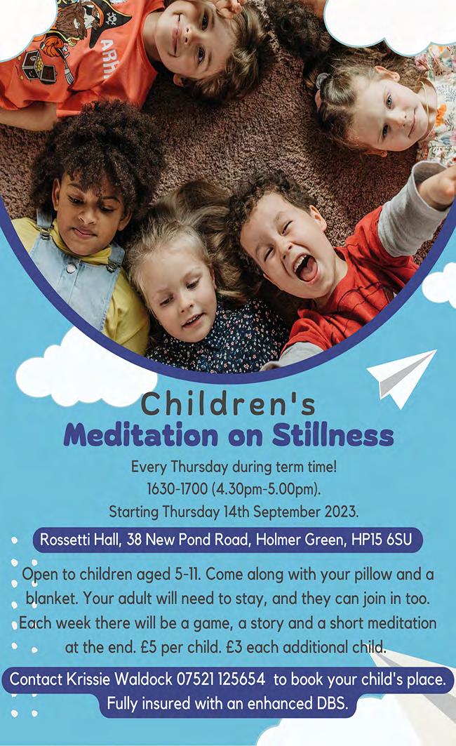 Guided meditation, ‘Meditation on Stillness’ classes are starting this term in Holmer Green for primary school aged children and will be held every Thursday (term-time) from 14th September. During each session there will be a game, a story and a short meditation. Children will be read a story about an emotion (e.g. anger, kindness, worry) and helpful techniques will then be talked about to help them manage these emotions and to let go of unhelpful thoughts. For more information and to book, please contact Krissie Waldock on: 07521 125654.