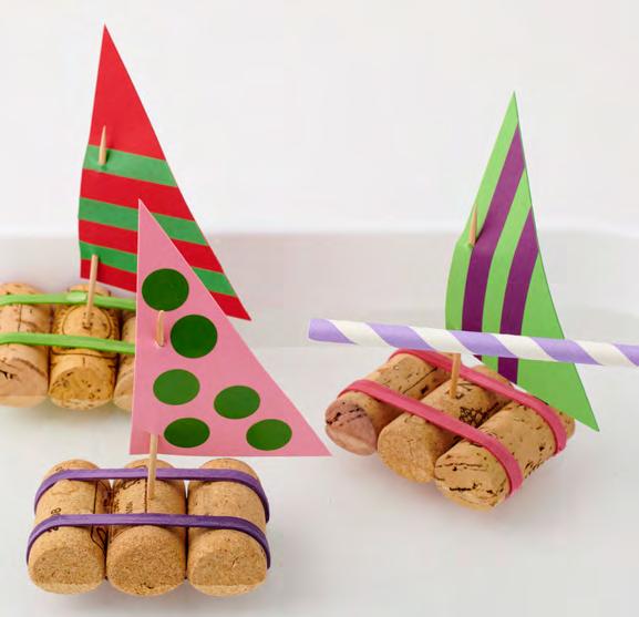 Make a paper sail and use the colouring pens to make a pattern. Push a cocktail stick carefully through the sail for a mast (adults, probably best you do this), then slowly stick it into the middle cork.
