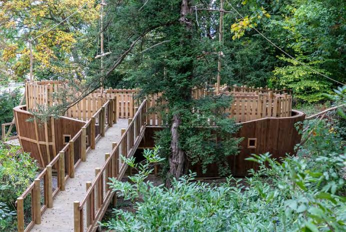 Woodland playground with rope park, zip wire, water/sand play, working farmyard.