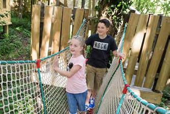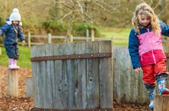 Woodland playground with rope park, zip wire, water/sand play, working farmyard.