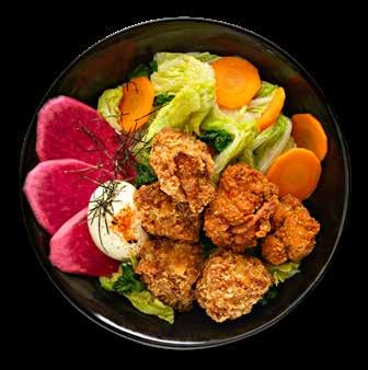 Lauwarme Bowl mit knusprigem Karaage Chicken, Jasminreis, Wasserspinat, Karotten, Chinakohl und Shichimi Veganaise 23.5