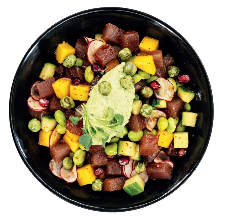 Poke mit Sushireis, Gelbflossen Tuna, Edamame, Gurke, Mango, Radiesli, Granatapfelkerne, Edamole & WasabiErbsen, mariniert mit Poke Sauce