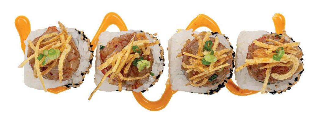 SPICY SHRIMPS TATAR ROLL NEW Uramaki mit Salat und Karotten, getoppt mit Spicy-Shrimp Tatar mit Sriracha, Frühlingszwiebeln und Potato-Crunch
