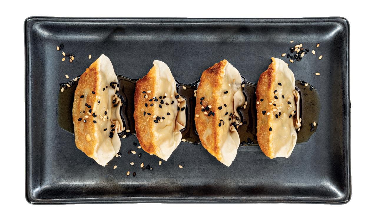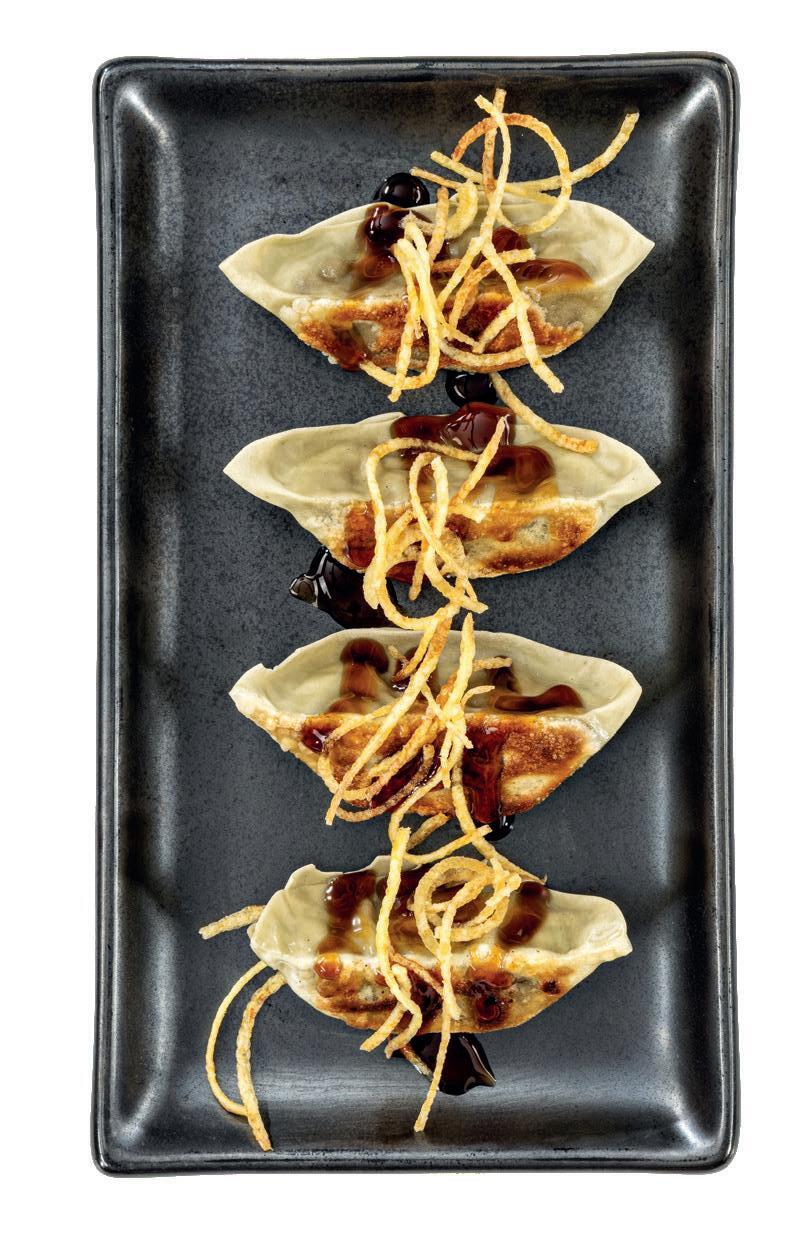 Gedämpfte, japanische Teigtaschen mit einer Füllung aus Trüffel, Edamame und Gemüse, dazu Potato-Crunch und Teriyaki-Sauce 12.90