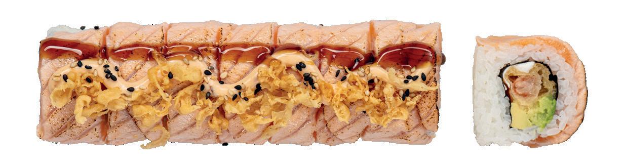 CRUNCHY SCOTMAN'S ROLL NEW Shrimps frittiert, Avocado und Mayonnaise, getoppt mit Lachs, Chipotle-Dip, Sesam, Crunchy Tempura und Teriyaki-Sauce