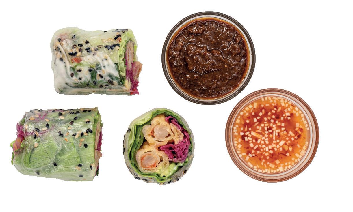 Summerroll mit Tempura Shrimps, Salat, Thai-Basilikum, Pfefferminze, gepickeltem Rotkabis, Avocado, Sesam und Sweet Chili Sauce, dazu Erdnuss-Dip & Nuoc Cham mit Fischsauce