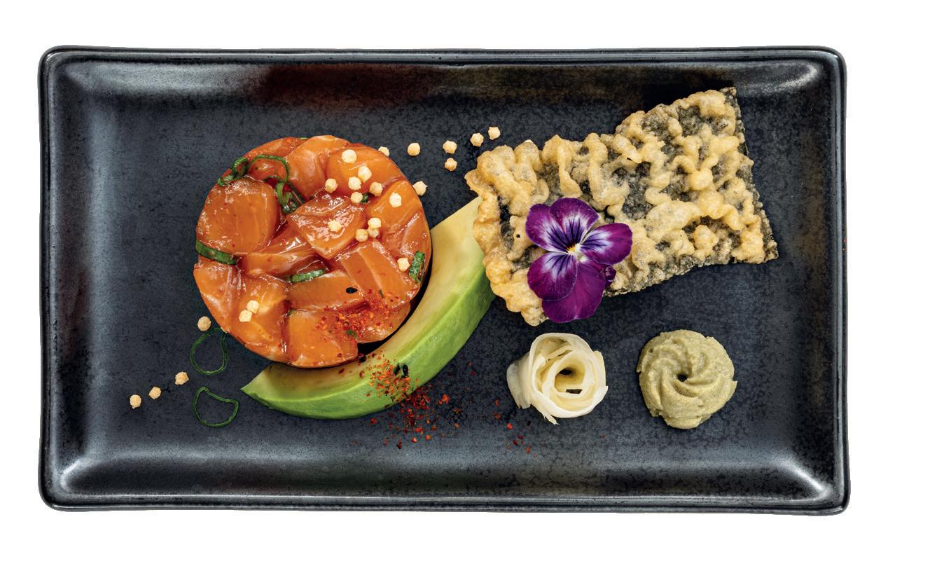 Pikantes Lachstatar mit Reiscracker und Microgreens auf frittierter Futomaki Roll mit Peperoni, Karotten und Spicy Sauce