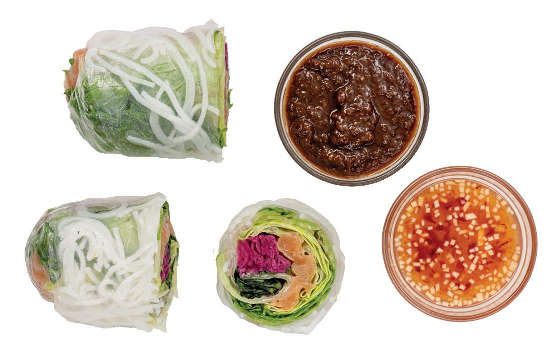 Summerroll mit Lachs, Reisnudeln, ThaiBasilikum, Pfefferminze und gepickeltem Rotkabis, dazu Erdnuss-Dip und Nuoc Cham mit Fischsauce