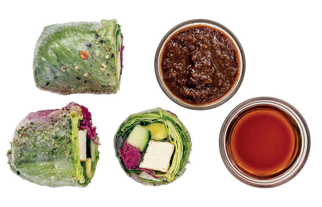 Summerroll mit Schweizer Tofu, Gurke, Mango, Thai-Basilikum, Pfefferminze und gepickeltem Rotkabis, dazu Erdnuss-Dip und Ponzu-Sauce