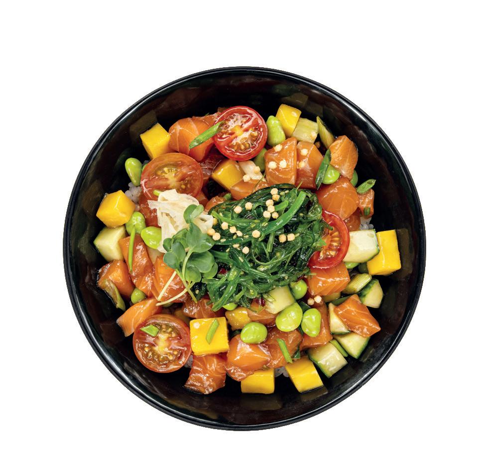 Poke mit Sushireis, Lachs, Gurke, Edamame, Kirschtomaten, süsser Mango, Wakame, Rettichsprossen und feiner Poke-Sauce