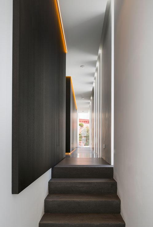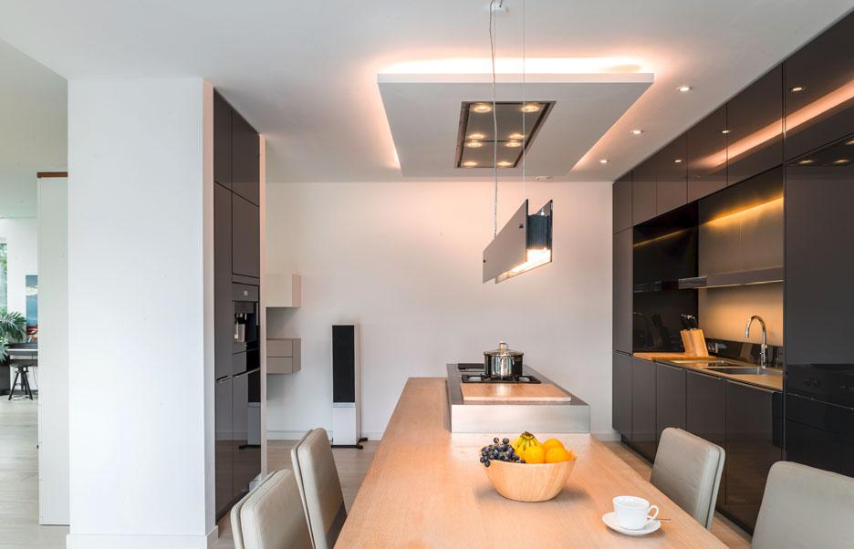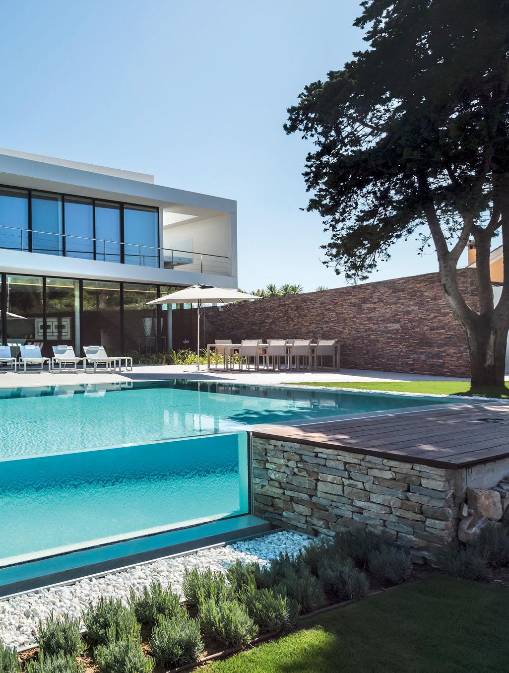 tektenbüro 123DV. Spüle und Keramikkochfeld sind fugenlos in die Struktur eingebettet, die eine Vielzahl verborgener Ablagemöglichkeiten und jede Menge Stauraum bietet. Die Kücheninsel verbindet somit mühelos Design und Funktion. Das geometrische Design der Insel harmoniert mit dem Grundriss der Küche und unterstreicht die Großzügigkeit des Raumes. Elemente wie die Spüle und das Cerankochfeld sind perfekt in die zentrale Struktur eingebettet und stehen im Einklang mit der von 123DV angestrebten klaren, minimalistischen Ästhetik. Die in die Holzverkleidung an den Wänden eingelassenen Einbaugeräte sorgen für eine ruhige Optik und verstärken das großzügige Raumgefühl. Diese Wände finden sich auch in anderen Räumen, sogar im Keller wieder, und stehen so für eine klare Linie. Die Glasfassaden fluten die Raumlandschaft mit viel natürlichem Licht und schaffen einen fließenden Übergang zwischen innen und außen. Die gesamte Villa bietet ihren Bewohnern maximalen Komfort: Alle technischen Geräte lassen sich zudem per Smartphone oder Tablet bedienen. Das gilt auch für die Lampen an der Fassade, deren warmes, einladendes Licht durch vertikale Schlitze strahlt. Das unbestrittene Highlight im Außenbereich ist der große Swimmingpool mit transparenten Wänden, der den mediterranen Charakter der imposanten Villa harmonisch ergänzt. (fri)