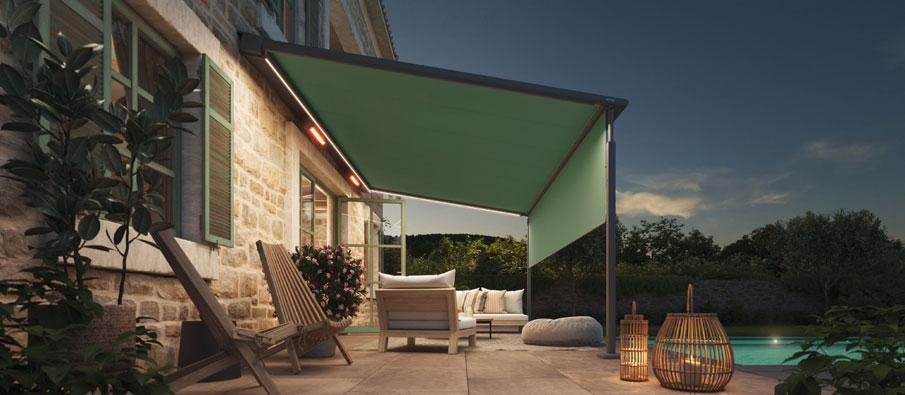In Farbe: Mit der Markise „markilux MX-4“ lässt sich ein individuelles Lichtambiente inszenieren. Alle Farben können stufenlos gesteuert werden – auch mit App-Lösungen, etwa von Philips Hue oder Somfy TaHoma. Markilux