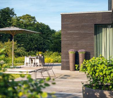 4. Optische Weite: Wer seinen Terrassenbelag auf angrenzende Wohnbereiche abstimmt, kann beides visuell verbinden. Zum Beispiel mit Fliesen im Holzdekor. Deutsche Fliese/Ströher Living