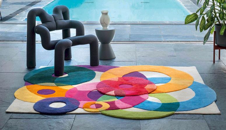 Farbe trifft Form: Der schicke Teppich „Bubbles Outline Rug“ aus neuseeländischer Wolle sorgt auch Outdoor für bequeme Momente.