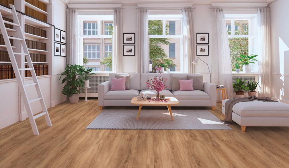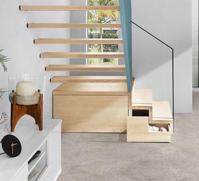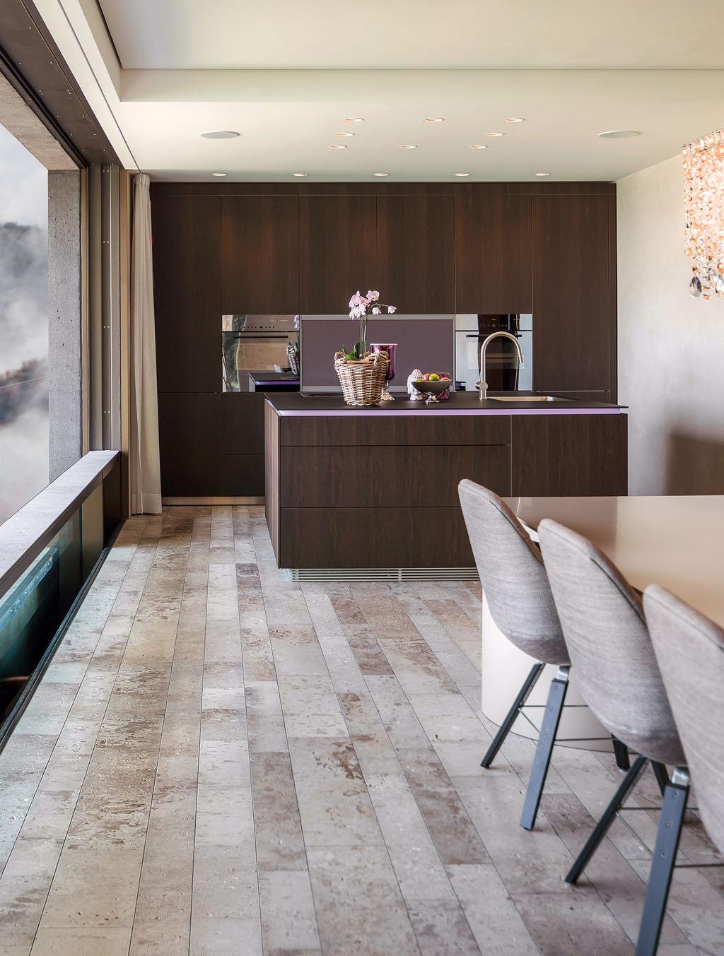 Brücke schlagen: Im Parkett format verlegt, sehen Sie hier einen keramischen Bodenbelag in Holzoptik, der Küche und Wohn bereich optisch verbindet. Deutsche Fliese/Steuler