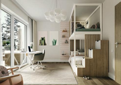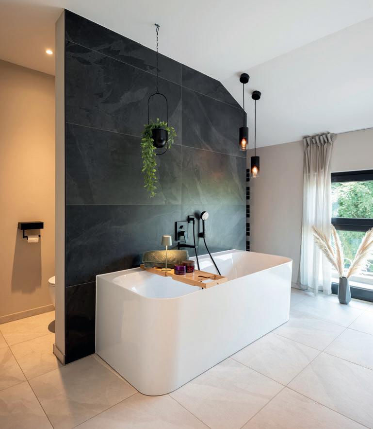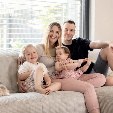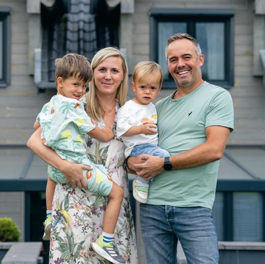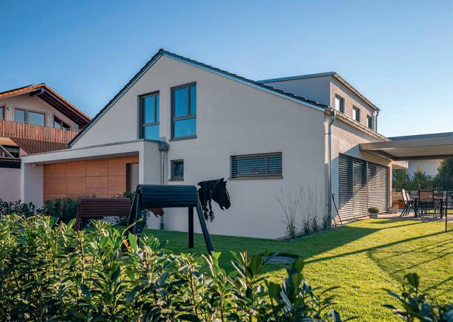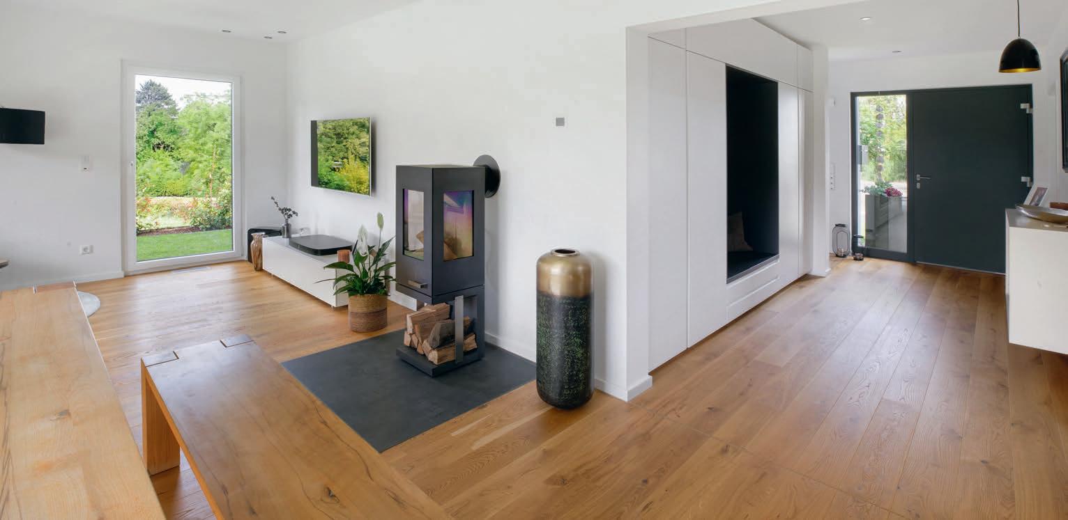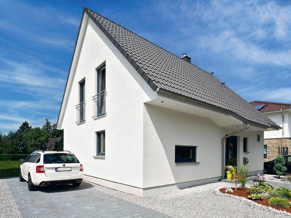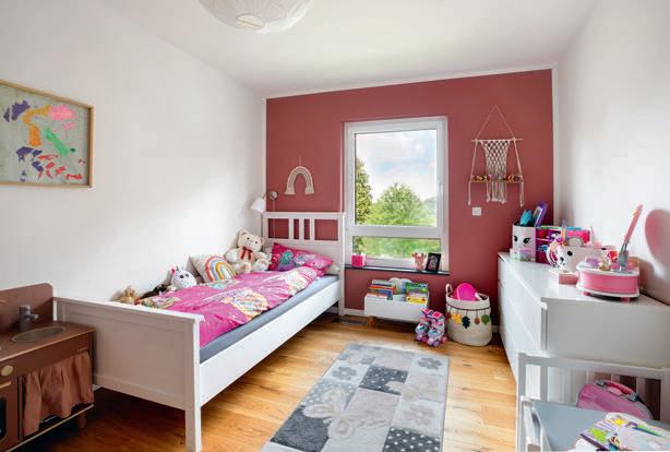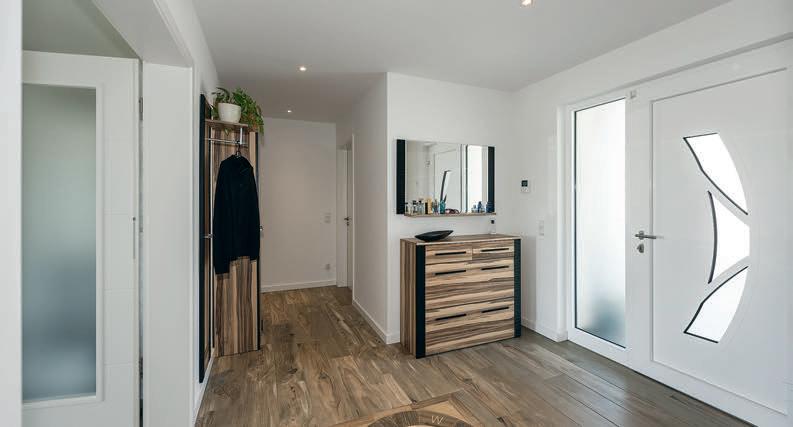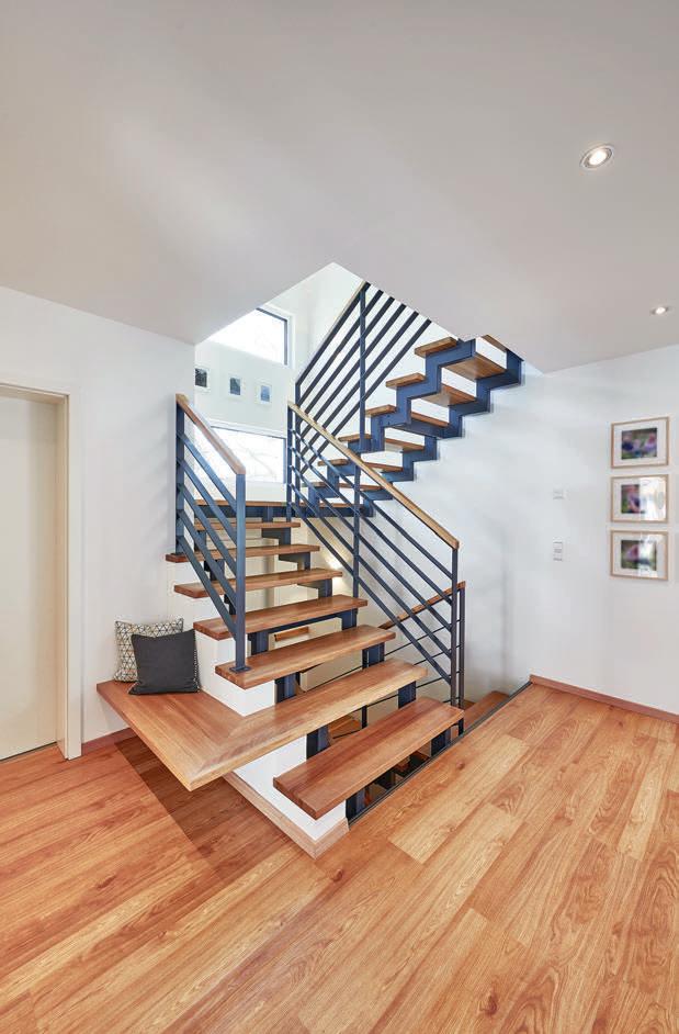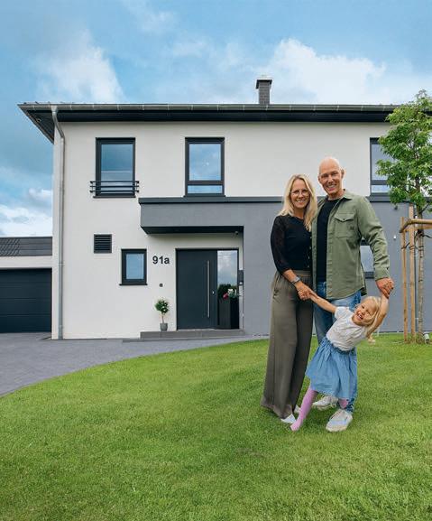 Bruders war wichtig, dass ihr neues uhause exibel ist. Dazu gehört das Gäste-WC mit Dusche im Erdgeschoss: „Wenn unsere Kinder erst einmal im Teenageralter sind, werden wir froh über die zweite Duschgelegenheit im Haus sein!“, meint ndreas. ie Bauherrin fi ndet den geschlossenen Abstellraum unter der halb gewendelten Treppe so praktisch. Im Obergeschoss ist neben zwei Kinderzimmern und dem Elternschlafzimmer mit Ankleide noch Platz für einen Extraraum. Praktisch für Feuerwehrmann Andreas und für Annika, die so trainieren können, während die jüngste Tochter, Alina, nebenan Mittagsschlaf hält.