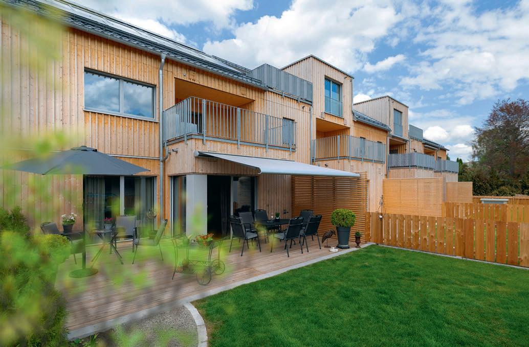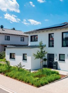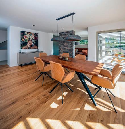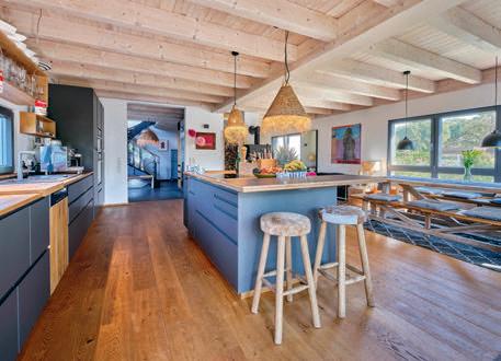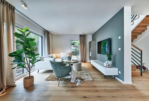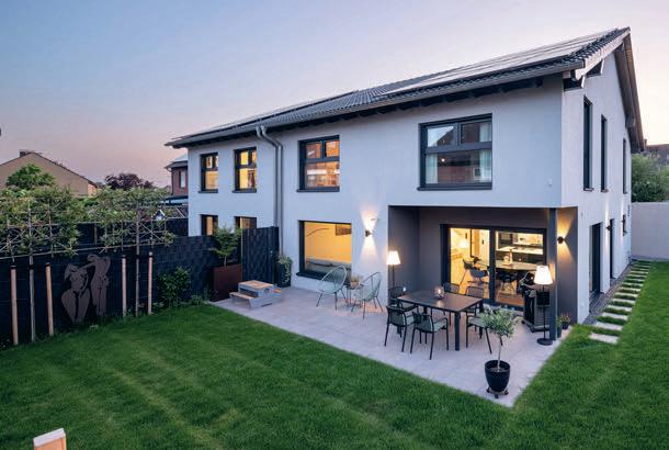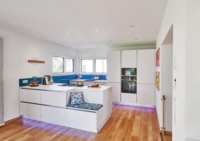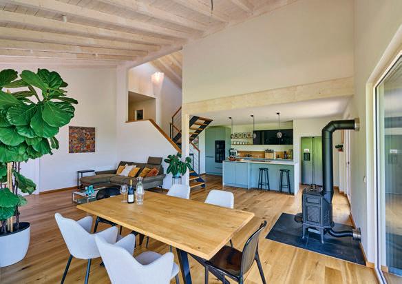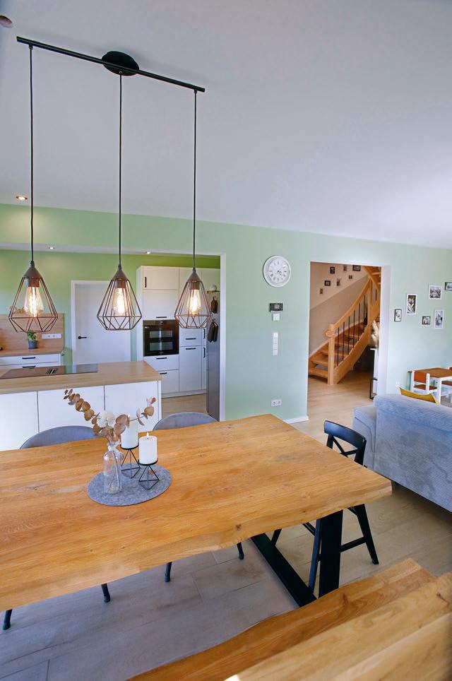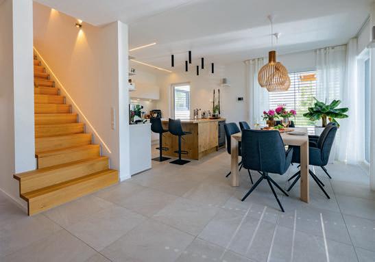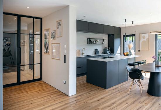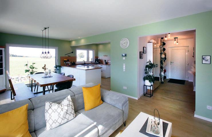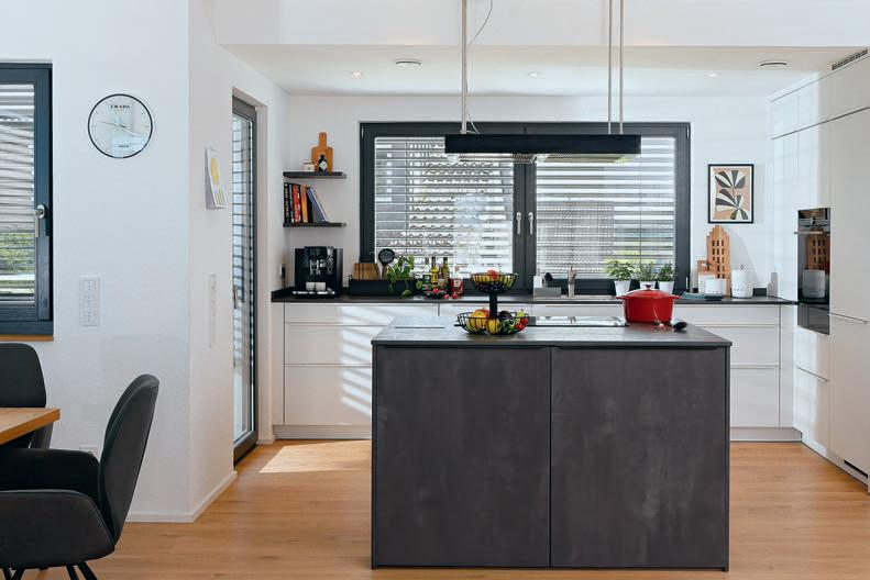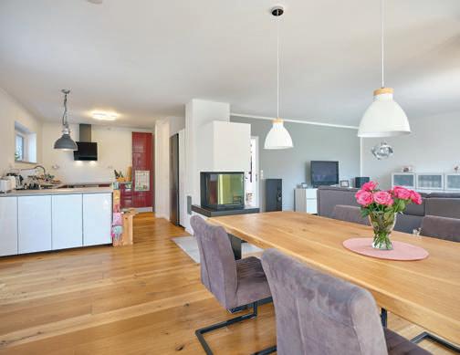 erlaubt trotzdem freie Blicke und Lichteinfall. Im offenen Wohn-, Ess- und Kochbereich sorgen große Fensterfronten und viele Fenster in der freien Giebelseite für Einfamilienhaus-Feeling: „So merken wir gar nicht, dass nebenan noch ein Haus ist“, freut sich die Bauherrin.