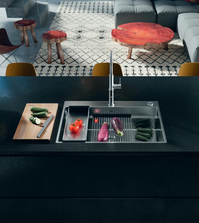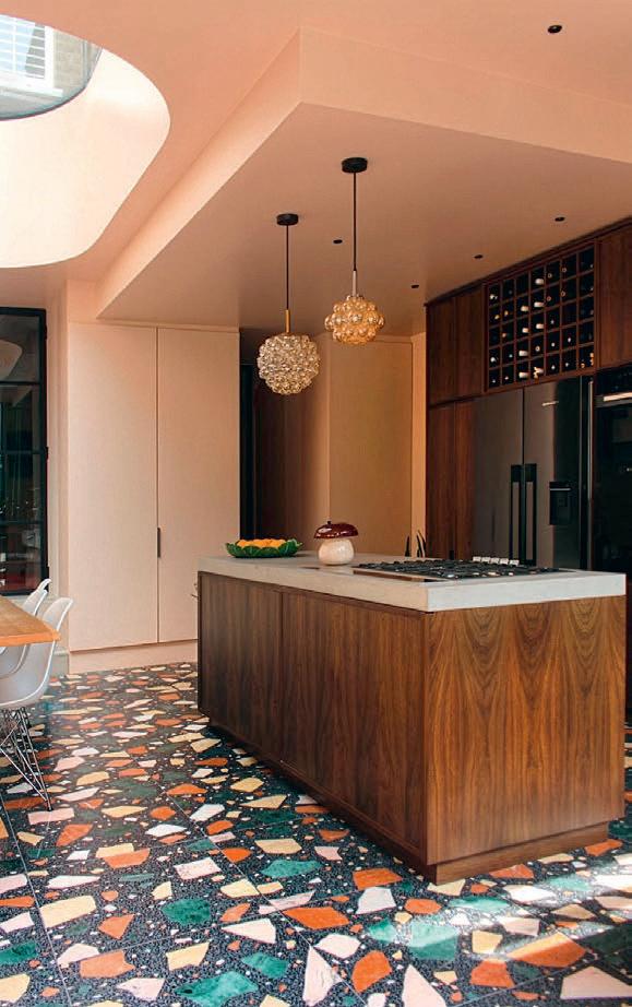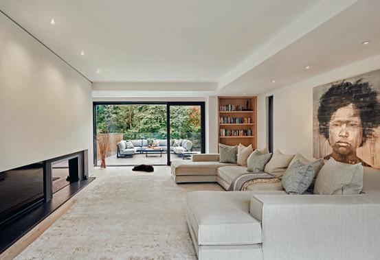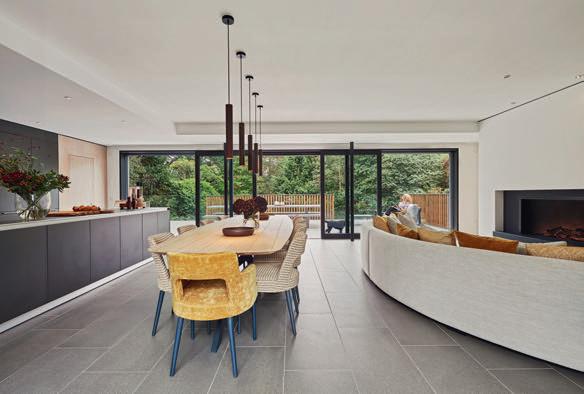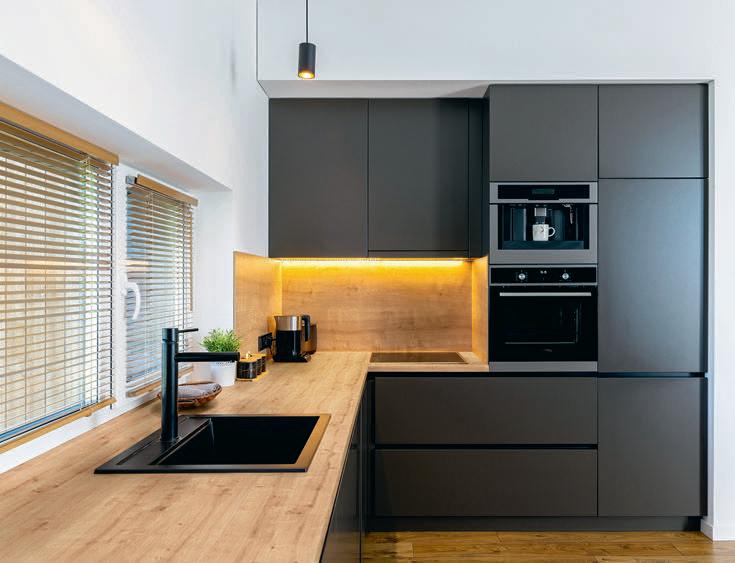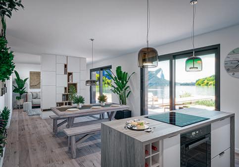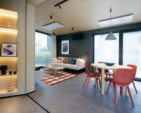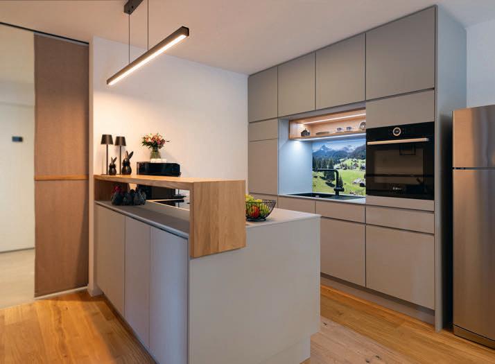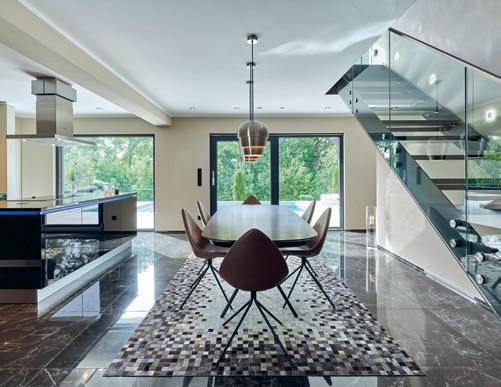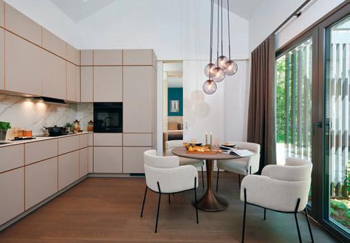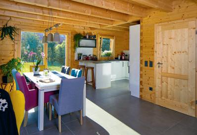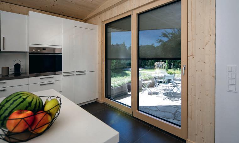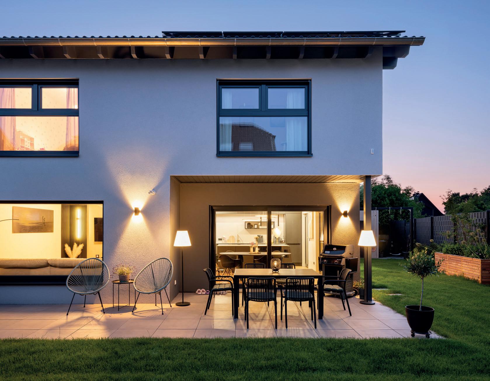 erlaubt trotzdem freie Blicke und Lichteinfall. Im offenen Wohn-, Ess- und Kochbereich sorgen große Fensterfronten und viele Fenster in der freien Giebelseite für Einfamilienhaus-Feeling: „So merken wir gar nicht, dass nebenan noch ein Haus ist“, freut sich die Bauherrin.