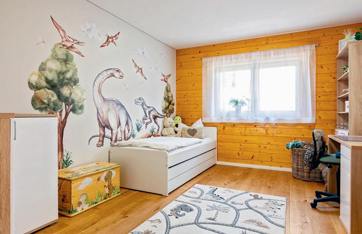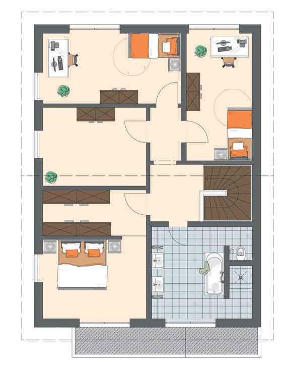 Das Obergeschoss bietet rund 84 Quadratmeter Wohnfläche. Genug für Elternschlafzimmer, ein großzügiges Familienbad und drei Kinderzimmer.