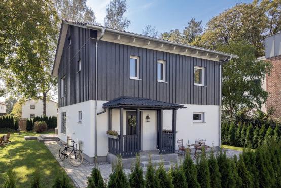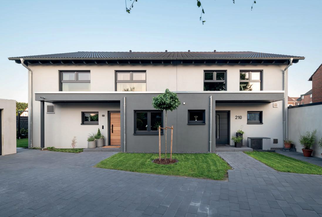 Quadratmeter große Wohnung für die Familie und eine kleinere Wohneinheit mit Platz für eine Einzelperson oder ein Paar. „Wir haben trotz der Unterschiede sehr auf ein einheitliches Erscheinungsbild des gesamten Doppelhauses geachtet“, erklärt Annika. Ein Erker verbindet die Haushälften optisch miteinander. Dieser verlängert sich zum Vordach für beide Eingangstüren. Für Annika und Andreas ist das ein praktisches Highlight: „So können wir uns bei schlechtem Wetter draußen von unseren Gästen verabschieden, ohne im Regen zu stehen.“