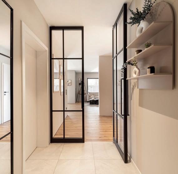 Die filigrane Tür im Loft-Stil trennt den Flur in zwei Bereiche. Die Glaselemente lassen Licht und Blicke ungehindert durch das Haus fallen.