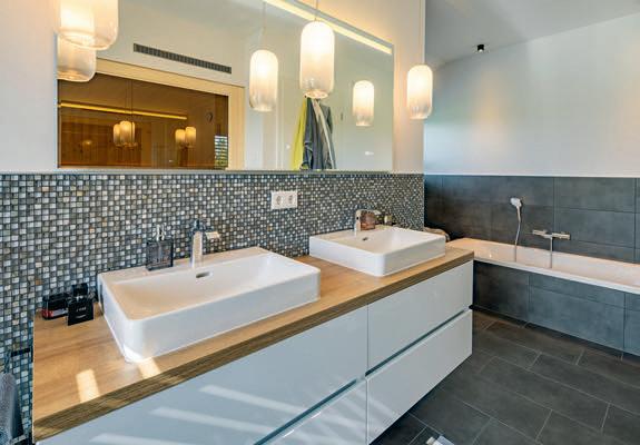 Im Familienbadezimmer kommen Badewanne, Dusche und ein Doppelwaschtisch bequem unter.