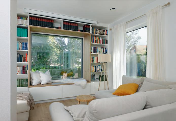 Die Cordcouch vor dem Panoramafenster zählt zu den Lieblingsplätzen der Familie.