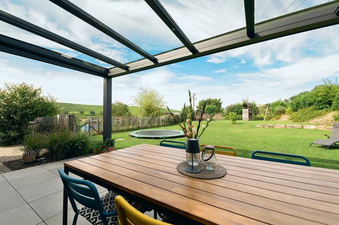 Vor dem Essbereich ist die Fassade zurückgezogen. So überdacht sie die Terrasse.