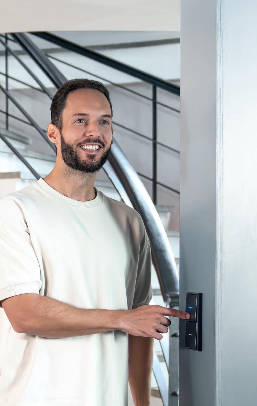 Entdecken Sie die Vielseitigkeit der JUNG HOME Taster! Mit einem Fingertipp können Sie Licht ein- und ausschalten, dimmen, Steckdosen steuern, Jalousien bedienen und die Raumtemperatur regeln.
