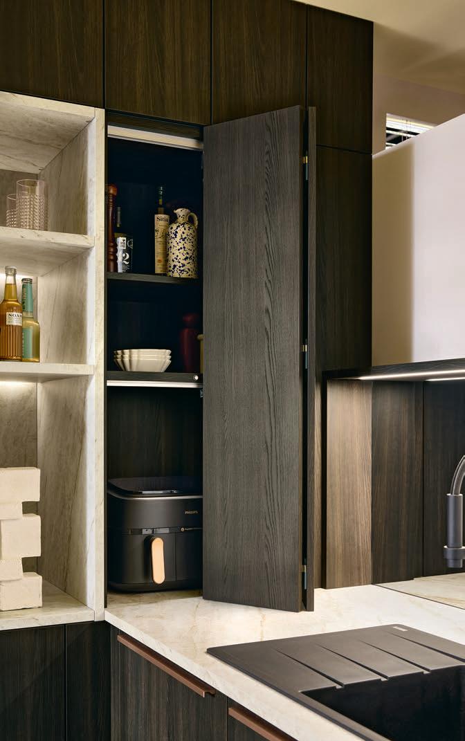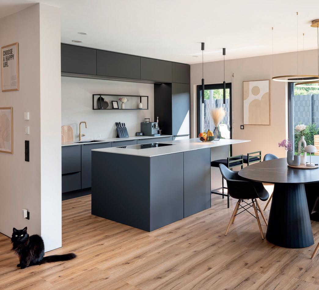 Die schwarze Küche passt perfekt zum modernen Einrichtungsstil der Familie… und zur Katze.