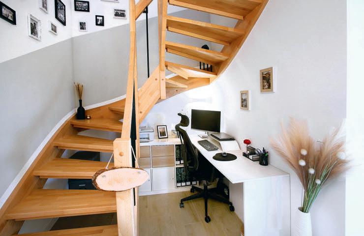 Die halbgewendelte Treppe verkleinert den Flur. Dafür entsteht mehr Platz in den Wohnräumen.
