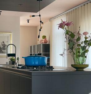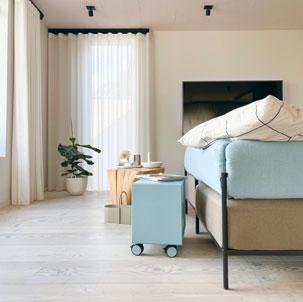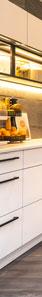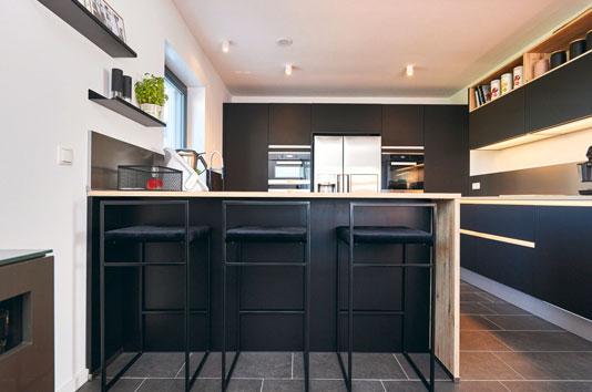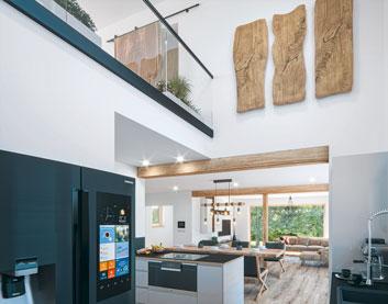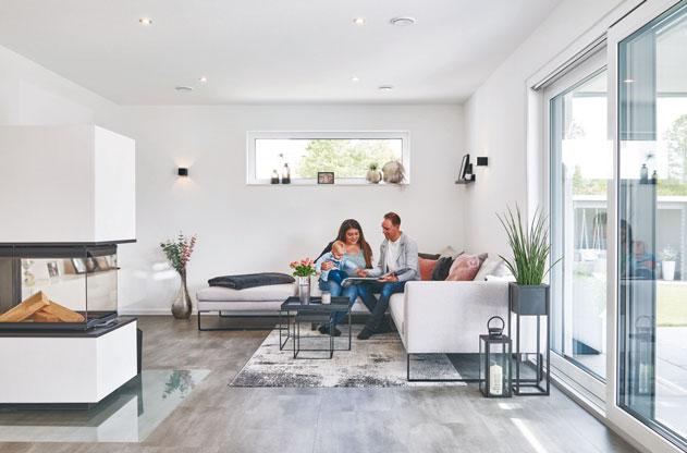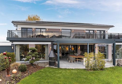 raumbelüftung entschieden. Für Heiko Staible hat die Lüftungsanlage noch einen weiteren Vorteil: „Ich bin Asthmatiker und allergisch gegen Hausstaub.“ Das Gerät reinigt die Luft kontinuierlich und tauscht sie aus. So können Staibles die Fenster geschlossen halten. Um Schimmel müssen sie sich wegen der Lüftungsanlage ebenfalls keine Sorgen mehr machen. Zur Nachhaltigkeit trägt das verbaute Smart-Home-System bei. Zum Beispiel dann, wenn sich die Rollläden automatisch öffnen und schließen und das Haus im Sommer weniger aufheizt und im Winter weniger Wärme entweicht. Dass ein smartes Haus den Alltag deutlich bequemer macht, will Heiko Staible gar nicht leugnen. Das Paar öffnet die Tür mit Fingerprint, geht von unterwegs an die Freisprechanlage oder täuscht während des Urlaubs durch Licht- und Rollladensteuerung per Smartphone ihre Anwesenheit vor. Lachend gibt der Bauherr zu: „Bei dem Komplettpaket waren auch Gadgets dabei, die wir kaum nutzen. Das Kochfeld steuere ich zum Beispiel nie mit dem Smartphone, obwohl es ginge.“