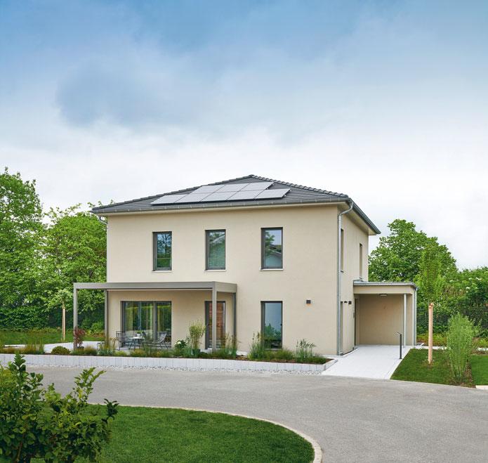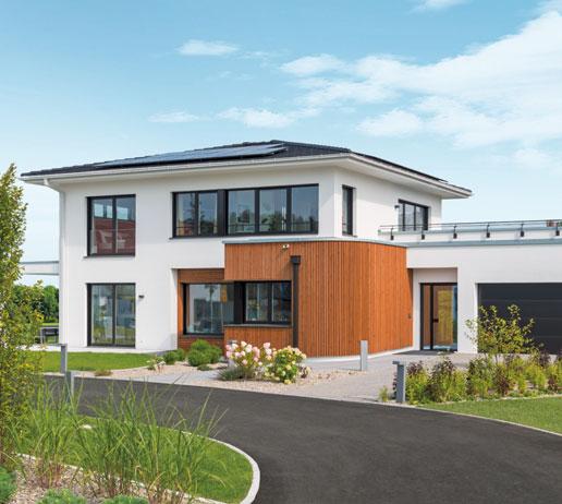 ne. „Wir hatten Spaß daran zu überlegen, wie unser Haus aussehen könnte“, erzählt der Bauherr. Konkret waren diese Pläne zwar nicht, trotzdem ist ihr heutiger Grundriss den ersten Skizzen sehr ähnlich. Wichtig war den Staibles eine Stadtvilla mit Walmdach. Der Essbereich wollten sie in einem großen Erker unterbringen. Damit dieser zu einem Highlight wird, haben die Bauherren ihn farblich vom restlichen Haus abgesetzt. Direkt anschließen ans Haus sollte die große Garage. „Häu-