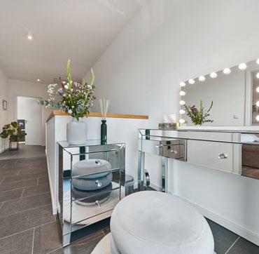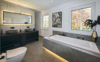 Das große Bad ist gleichzeitig Familienbad und Bad-en-Suite. Eine Tür führt in den Flur, eine andere über die Ankleide ins Schlafzimmer.