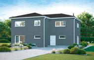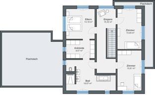 Die 183 Quadratmeter Wohnfläche verteilen sich auf zwei Vollgeschosse. Im Obergeschoss gibt es keine Dachschrägen.