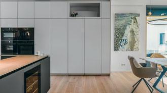 Das Farbkonzept zieht sich durchs ganze Haus: weiße Wände mit grauen Möbelstücken und Holzelementen.