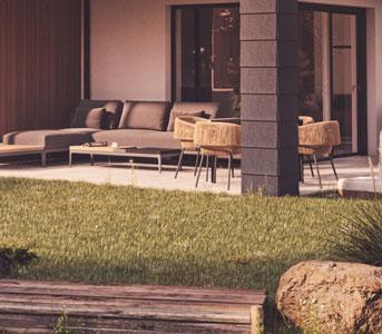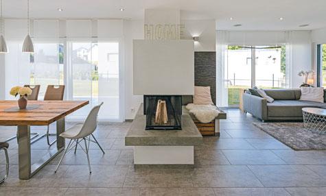 „Ich würde unseren Stil als modern, schlicht und zeitlos beschreiben“, erklärt Heiko Staible. Durch den minimalistischen Look hebt sich der Lieblingsplatz der Familie hervor: Der offene Kamin trennt den Essbereich vom Wohnzimmer und sorgt für Gemütlichkeit. „Im Winter legen wir ein Fell vor den Kamin und kuscheln uns mit unserem Sohn davor“, erzählt der Bauherr. Im Sommer spielt sich das Familienleben draußen ab. Auf der Terrasse sitzt das Paar gern unter der großen Überdachung, schaut ihrem Sohn beim Spielen zu oder grillt mit der Familie. Den Garten möchten Staibles in den nächsten Jahren weiter verschönern. „Wir wollen einen Brunnen bauen und un-