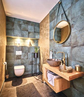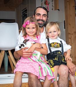hin und her bewegt und haben so einen Grundriss gefunden, der für uns passt“, erzählt Michael Ritter. Dass sich alle wohlfühlen, liegt nicht nur am Grundriss. Wie schon beim Hausentwurf legte der Bauherr viel Herzblut in die Innengestaltung. „Ich mache meistens die Planung der Projekte erst zeichnerisch, dann baue ich ein Modell und meine Frau stimmt ab, ob es ihr gefällt oder nicht“, so der Heimwerker. Wird ein Projekt abgesegnet, helfen Freunde und Familie bei der Umsetzung. Mit einem befreundeten Zimmermann ist beispielsweise die Holzwand im Bad entstanden. Michael Ritter erinnert sich: „Badezimmer in Ausstellungen waren mir oft zu altmodisch, deswegen haben wir gedacht, machen wir viel selbst.“ Das hat sich ausgezahlt: Ob die individuelle Badgestaltung, die liebevoll gestalteten Kinderzimmer oder der selbstentworfene Küchen-Garderoben-Würfel –das Haus der Ritters strahlt Persönlichkeit aus und hebt sich stilvoll von Mainstreamtrends ab.