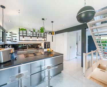 Der schwarze einenGarderoben-WürfelKüchen-setzt besonderen Akzent. In ihm versteckt sich das Arbeitszimmer von Michael Ritter.