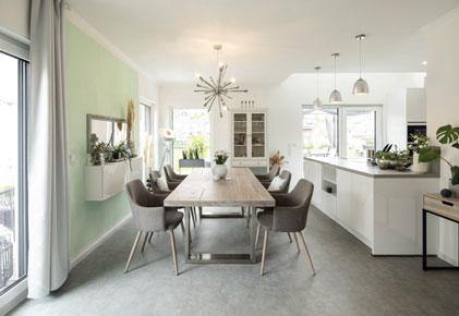Der große Wohn- und Essbereich mit offener Küche ist das Herzstück des Hauses. PLATZ FÜR ALLE Drei Kinderzimmer, ein Elternschlafzimmer mit Ankleide und ein Familienbad – das DG wird perfekt genutzt.